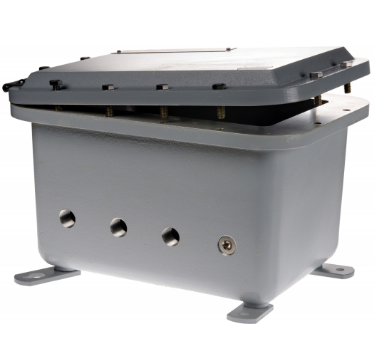 open 3/4" NPT cable entries for cable conduits. The power supply can connect to 120 V AC, 230 V AC, or 24 V AC. The